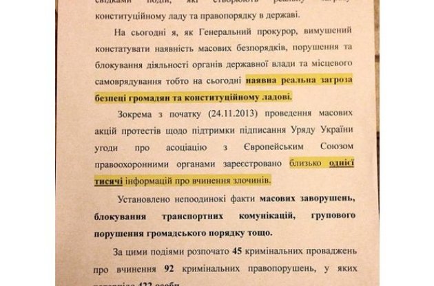 Згідно з опублікованими документами, Пшонка мотивував введення режиму НС тим, що з моменту початку масових акцій протесту в Україні зросла кількість повідомлень про порушення закону, фактів блокування транспортних комунікацій, існувала загроза життю українців та конституційному ладу.