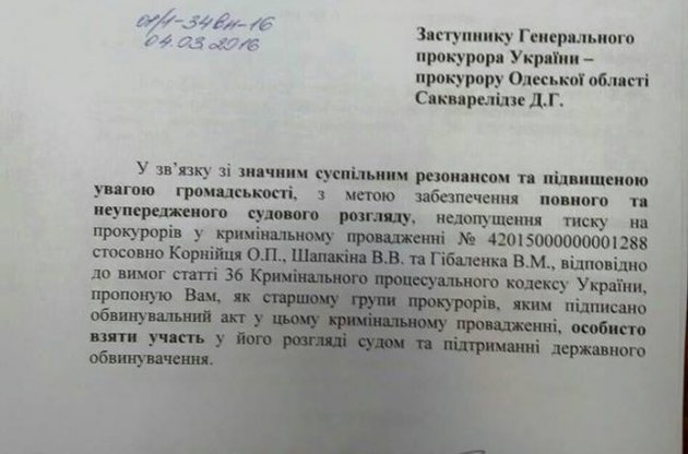 "У зв'язку зі значним суспільним резонансом і підвищеною увагою громадськості, з метою забезпечення повного і неупередженого судового розгляду, недопущення тиску на прокурорів у кримінальному провадженні щодо Корнійця, Шапакіна і Гібаленка, у відповідності з вимогами статті 36 Кримінально процесуального кодексу України, пропоную вам, як старшому групи прокурорів, які підписали обвинувальний акт у цьому кримінальному провадженні, особисто взяти участь у її розгляді судом і підтриманні державного обвинувачення", - йдеться в листі.