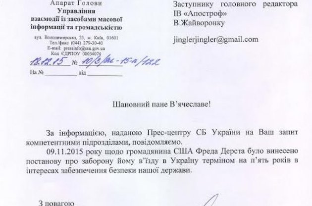 "09.11.2015 року відносно громадянина США Фреда Дерста було винесено постанову про заборону йому на в'їзд в Україну терміном на п'ять років в інтересах забезпечення безпеки нашої держави", - йдеться в офіційній відповіді СБУ на запит сайту "Апостроф".