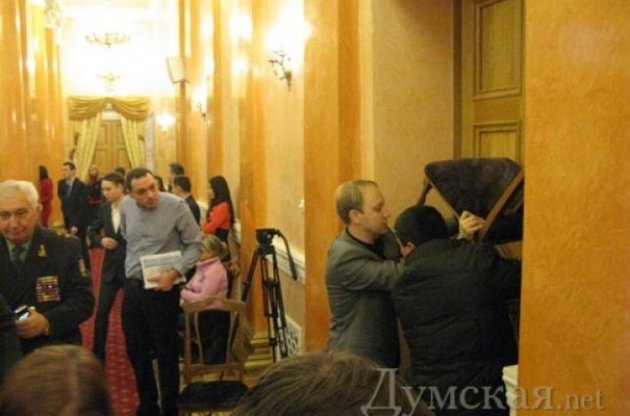 Близько сотні людей штурмують залу, де проходить сесія Одеської міськради. Депутати помітно нервують, рішення приймаються квапливо і без обговорення. Двері в залу блокують самі депутати.