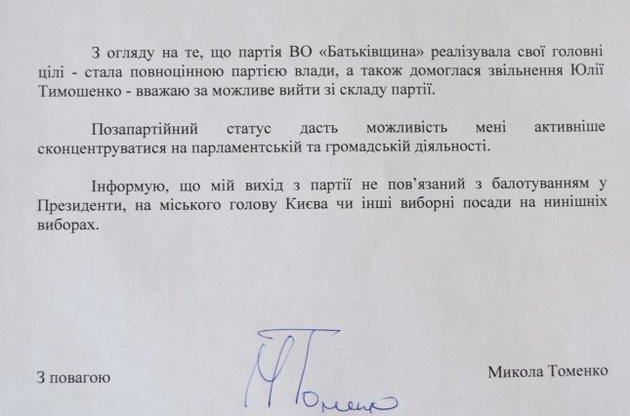 "Враховуючи, що партія ВО "Батьківщина" реалізувала свої головні цілі - стала повноцінною партією влади, а також домоглася звільнення 3 - вважаю можливим вийти зі складу партії", - йдеться у заяві Томенка, оприлюдненому на сайті політика у середу, 2 квітня.