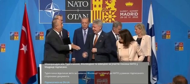 Лідери Туреччини, Швеції та Фінляндії готують спільний документ за підсумками переговорів, що відбулися в Мадриді, про перспективи вступу Гельсінкі і Стокгольма до НАТО і побоювання Анкари у зв'язку з цим, повідомляє канцелярія президента Фінляндії Саулі Ніїністе