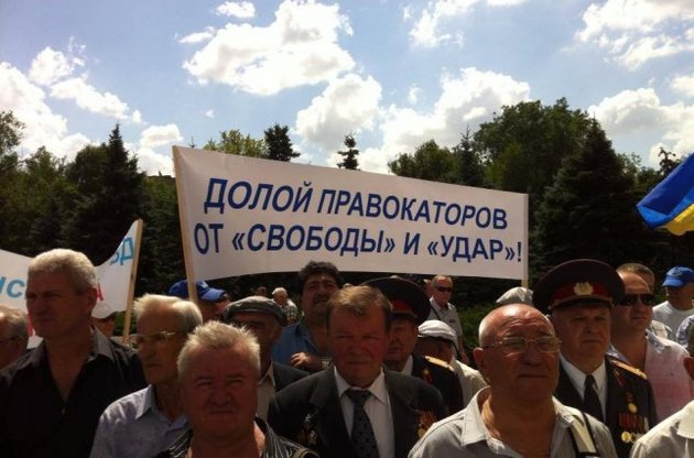Учасники мітингу, серед яких були представники громадських організацій ветеранів МВС, Збройних сил і спецслужб різних міст і районів області тримали в руках плакати "Міліція була і буде з народом", "Ветерани МВС - захистимо міліцію", "Геть провокаторів від "Свободи" і "УДАРу".