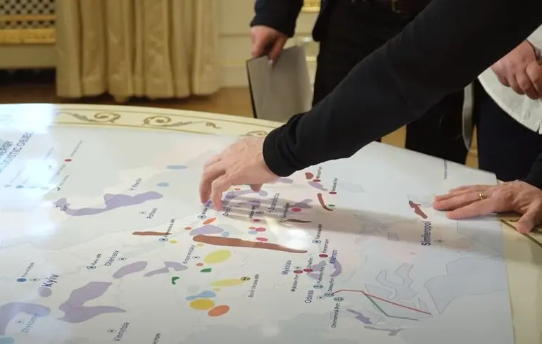 Зеленський показав журналістам карту рідкісноземельних ресурсів України. За його словами, це уран, титанові та марганцеві руди, рідкісноземельні елементи, літій, природний газ та десятки інших ресурсів, від яких залежить геополітика.