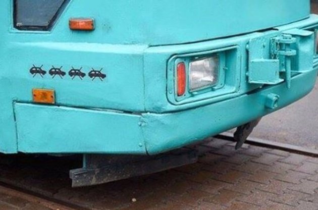 А далі найцікавіше. Досвід пішов у народ. І такими методами виховання культури на дорогах почали пишатися. Не вірите - ось фото, зроблене днями в Мінську. Правда, забавно? Бампер трамвая з чотирма значками "перемоги".