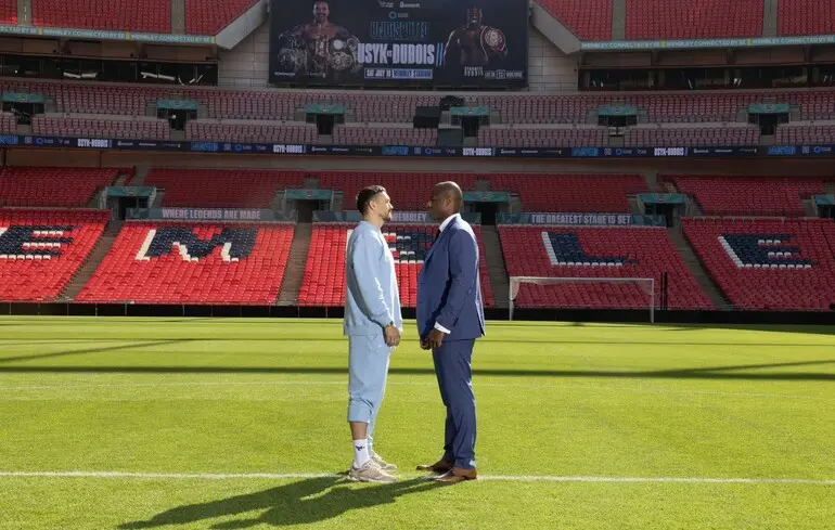 Боксери вийшли на газон арени "Вемблі" у Лондоні, де пройде їхній другий бій. Під кінець дуелі поглядів Дюбуа відштовхнув українського чемпіона та обізвав його Pussy.