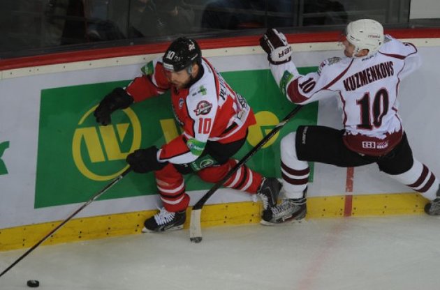 Однак донеччани зустріли серйозний опір динамівців , багато з яких представляють сильну збірну Латвії. Правда перед цим " Донбас " традиційно відкрив рахунок. Втім , це було все , що зуміли організувати в атаці господарі в першому періоді. До середини гри рижани тричі засмутили Лацо і вийшли вперед 3:1.