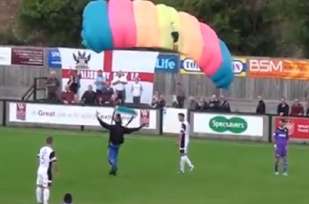 Інцидент стався в минулі вихідні в ході зустрічі між "Салісбері Сіті" і "Честером" на очах 1000 глядачів, присутніх на трибунах. Парашутист з'явився на полі у другому таймі, спокійно зібрав парашут і пішов під оплески фанів.