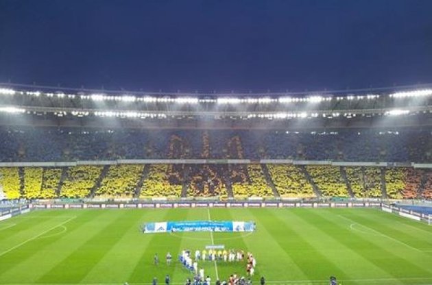 За кілька хвилин до виходу футболістів на офіційну церемонію привітання глядачі у всіх секторах по команді підняли спеціальні таблички білого, жовтого і синього кольорів. Центром композиції став тризуб кольорів національного прапора, який утворився на який утворився на центральних секторах східної трибуни (зі сторони готелю "Русь").