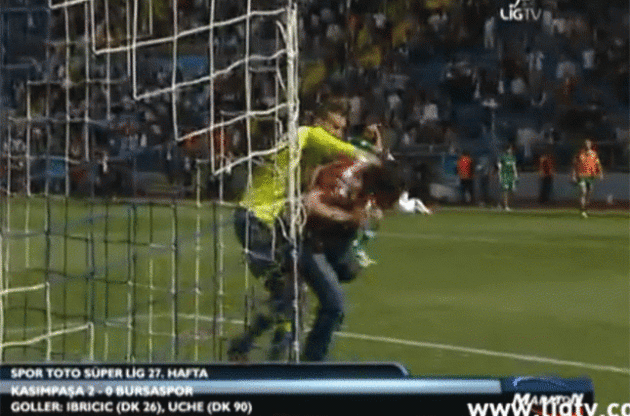 У кінцівці матчу 27-го туру турецької Суперліги між командами "Касимпаша" і "Бурсаспор", які є сусідами на турнірній таблиці, відбувся скандальний інцидент. Уболівальник, який вибіг на поле, напав на голкіпера "Бурсаспора" Харуна Текіна, але отримав гідну відповідь.