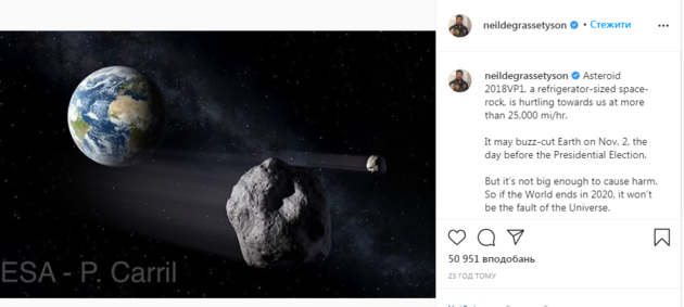 "Астероїд може стокнуться із Землею 2 листопада, за день до виборів президента", - повідомив Ніл Деграссі Тайсон.