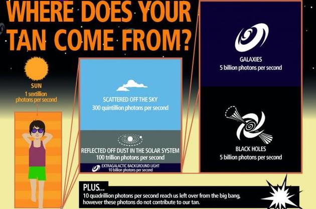 За словами дослідників, кожну секунду, яку людина проводить лежачи на пляжі, її шкіру атакують близько секстіліона фотонів. Більшість з них походять від Сонця, але 10 мільярдів фотонів припадає на частку позагалактичних частинок.