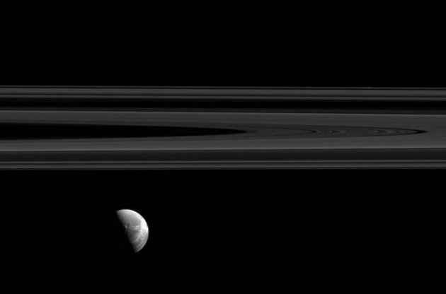 Космічна станція Cassini передала на Землю знімок, на якому можна помітити Діону, що "зависла" під кільцями Сатурна. Зображення було опубліковане на офіційному сайті NASA.
