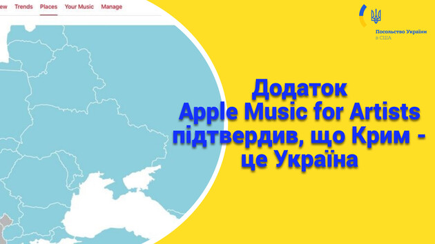 Додаток для музикантів Apple Music for Artists виправив допущену раніше помилку на вбудованих картах, де Крим не був частиною України. Тепер Крим зображено як частину України. Про це повідомляє у Facebook посольство України у США.