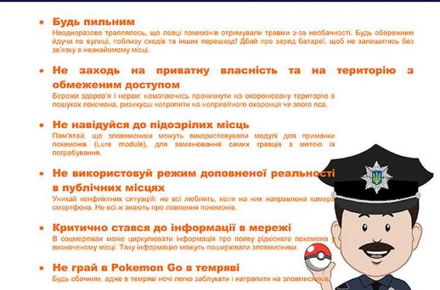 МВС, використовуючи зарубіжний досвід реагування державних органів на інциденти, пов'язані з Pokemon GO, "з метою здійснення превентивної діяльності щодо недопущення тяжких наслідків для шанувальників гри", опублікувало інфографіку з попередженнями для гравців.