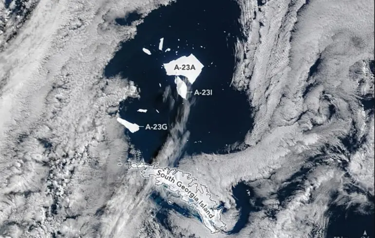 Поруч із ним можна побачити інші великі фрагменти льоду. На момент отримання знімка площа айсберга A-23G становила 324 квадратних кілометри, а площа айсберга A-23I — 344 квадратних кілометри.
