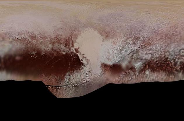 У центрі знімка розташовується плато Супутник, ліва половина "серця" Плутона. Екватор карликової планети ділить приблизно навпіл мережу з темно-червоних структур в нижній третині зображення.
