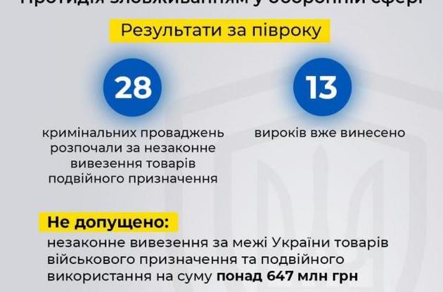 "Через виявлені порушення у сфері експортного контролю накладено штрафних санкцій на суму понад 137 мільйонів гривень. За відповідними матеріалами СБУ судами вже винесено 13 вироків. За іншими фактами тривають слідчі дії для встановлення всіх обставин правопорушень та притягнення до відповідальності осіб, причетних до протиправної діяльності" - повідомляють в СБУ.