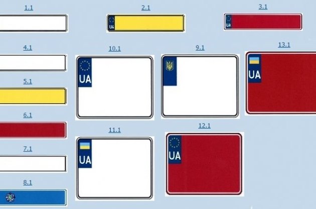 В цілому, зареєстровано 13 варіантів номерного знака для авто - з білим, червоним і жовтим фоном. Всі відрізняються від існуючих, оскільки прапор України розташоване зліва на синьому тлі. Крім того, замість прапора України на деяких варіантах знаків зображений герб України або "зоряне кільце" Євросоюзу.