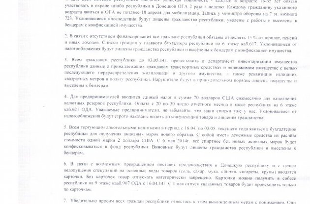 У цих паперах сепаратисти вимагають від бізнесменів платити їм єдиний податок в 70 дол. США щомісяця "для поповнення золотовалютних резервів республіки". Крім того, українські акцизні марки на алкоголь оголошено недійсними, а нові "республіканські" сепаратисти готові продавати по 2 дол. США. З 6 травня представники "ДНР" обіцяють конфіскувати всі спиртні напої без їхніх акцизів".