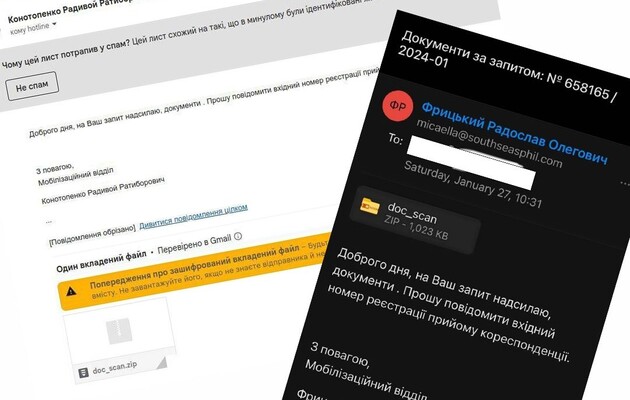 Зазначається, що імена, від яких приходять листи, є демонстративно вигаданими - наприклад, Конотопенко Радивой Ратиборович, а приписка про «мобілізаційний відділ» може збити з пантелику та змусити натиснути на файл.