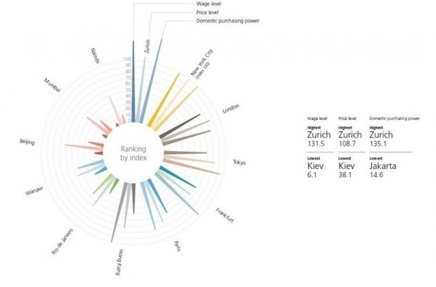 Особливо показове порівняння зарплат між найдорожчим і найдешевшим містом. У рейтингу UBS зазначається, що після сплати податків середній житель Цюріха заробляє $ 41, що в 21 раз більше, ніж житель Києва. При цьому різниця у вартості життя - лише у 2,8 рази.