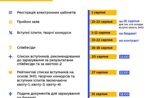Так, для вступників на основі повної загальної середньої освіти реєстрація електронних кабінетів розпочнеться 1 серпня, приймання заяв та документів триватиме з 13 по 22 серпня (для вступників за результатами ЗНО), і до 16 серпня для вступників, які складатимуть вступні іспити.