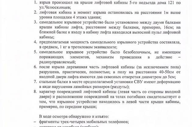 Згідно з документом, на місці вбивства терористів, зокрема, були виявлені чотири 9-мм кулі, який пройшли канал ствола, фрагменти трьох-чотирьох мобільних телефонів, антена від портативної радіостанції Motorola, зброя, патрони, гранати і т. д.