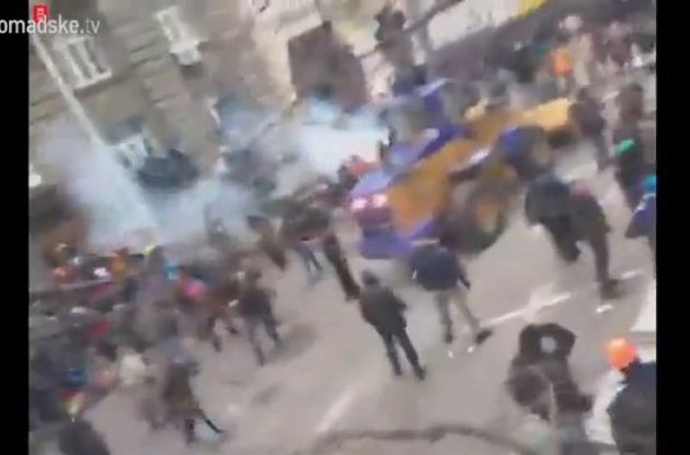 Біля будівлі Адміністрації президента спалахи світла і дим. Люди відходять назад. Хтось пустив сльозогінний газ.