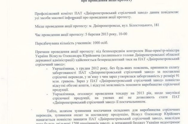 "Допоможіть! Нас розоряє екс-губернатор, а нині віце-прем'єр Олександр Вілкул. Вся наша надія на ЗМІ. Без коштів хочуть залишити 1 200 сімей. Ми готові до протесту. Відправляємо Вам офіційний документ нашої профспілки", - йдеться в тексті листа.