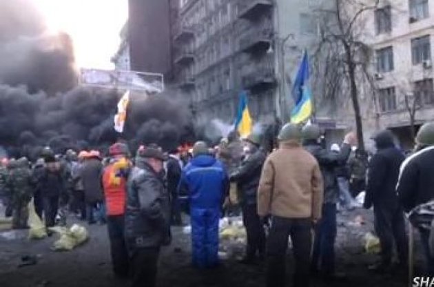 На вулиці Грушевського у Києві відновилося протистояння. Протестувальники знову палять покришки, а силовики намагаються загасити вогонь, застосовуючи водомет.