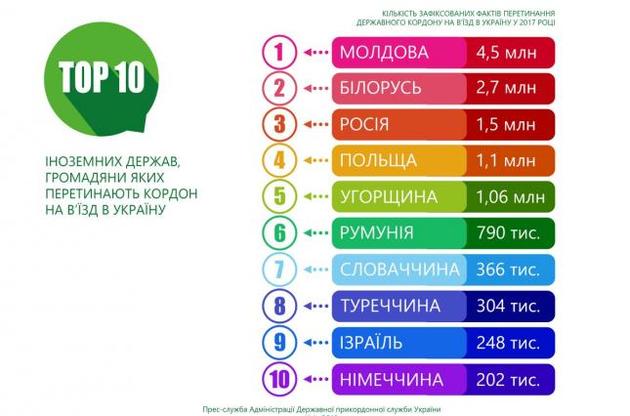 Згідно з рейтингом іноземних держав, громадяни яких найчастіше перетинають держкордон України, Молдова займає перше місце з 4,5 млн фактів в'їзду громадян на територію нашої держави. Громадяни Білорусі в'їжджали в Україну 2,7 млн разів, Росії – 1,5 млн, повідомляє Держприкордонслужба України.