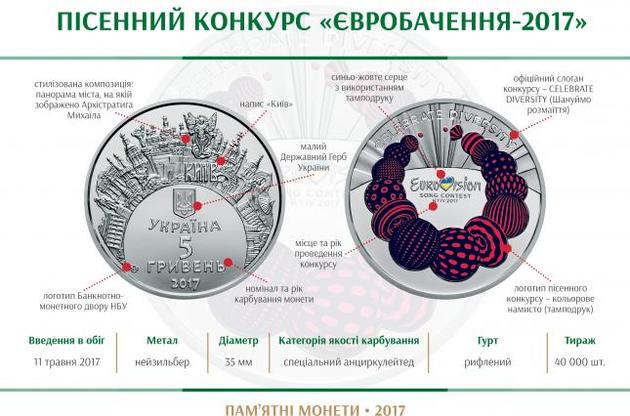 Монета номіналом п'ять гривень виготовлена з нейзильберу. На аверсі монети розміщено стилізовану композицію: панорама Києва, на якій зображений архістратиг Михаїл. На реверсі монети зображені офіційні слоган і логотип "Євробачення": різнокольорове намисто, в центрі яких розташовується синьо-жовте серце, а також написи Eurovision song contest Kyiv 2017 та Celebrate diversity.