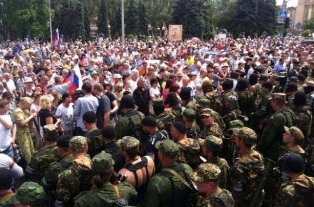 Близько 2 тисяч осіб зібралися на мітинг проти проведення виборів президента України на площі Леніна в Донецьку. Туди ж прибули бійці батальйону "Схід" - збройних сил сепаратистів.