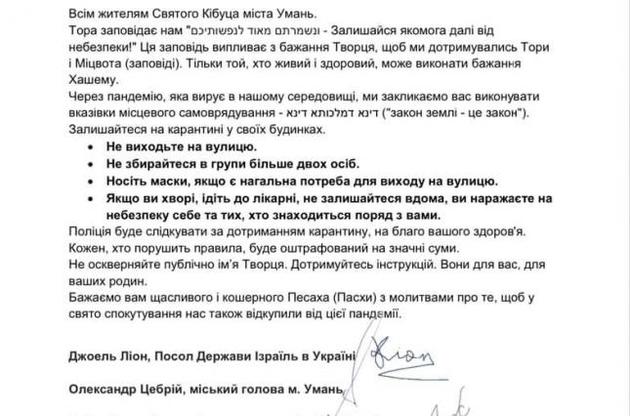 Посол Ізраїлю в Україні Йоель Ліон та глава міста Умань Олександр Цебрий звернулися до хасидів з проханням не відвідувати в цьому році Україну через епідемію коронавірусу та залишитися вдома. Своє звернення вони опублікували в Facebook.