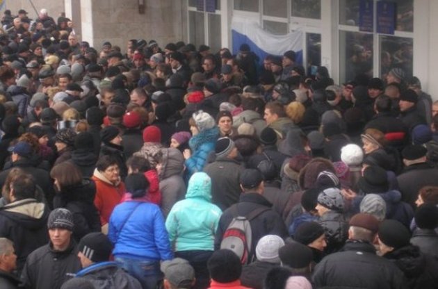 Мітингувальники відтіснили бійців внутрішніх військ, що охороняли будівлю, виламали двері і вибили вікна.
