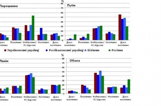Хоча етнічні росіяни в південно-східних областях висловлюють велику симпатію до Путіна і велику антипатію до Обами, ніж українці, але навіть серед них відсоток тих, хто негативно сприймає Путіна перевищує відсоток тих, хто ставиться до нього позитивно. Відмінності між україномовними і російськомовними українцями ще менше. Кожна лінгво-етнічна група неоднорідна у своїх оцінках.