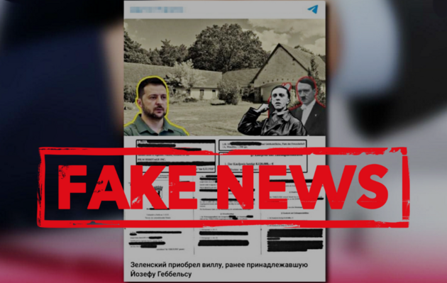 Російські пропагандистські Telegram-канали поширюють фейк про те, що президент України Володимир Зеленський за 8 мільйонів євро купив віллу міністра пропаганди часів нацистської Німеччини Йозефа Геббельса.