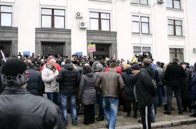 Перед будівлею мітингувальники, переважно, жінки, кричать "Росія", "Донбас". !zn