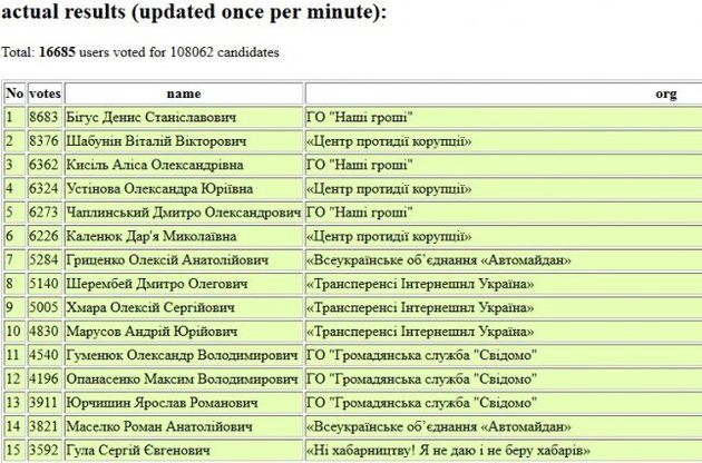 Більшість з них - представники антикорупційних організацій та журналісти-розслідувачі. Всього в голосуванні взяло участь 16685 осіб.
