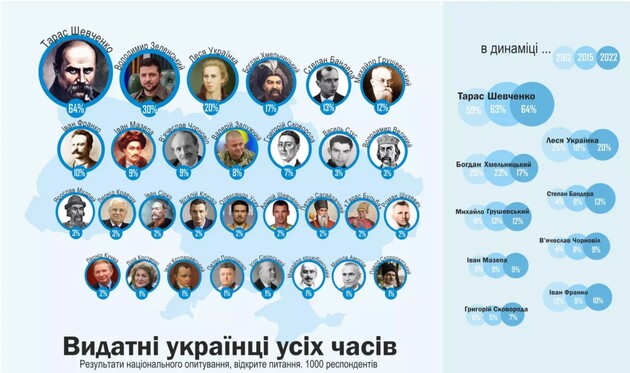 Серед найвидатніших українців усіх часів цього року громадяни, окрім незмінного лідера Тараса Шевченка, зарахували до першої п’ятірки найвидатніших президента Володимира Зеленського (29,8%), письменницю Лесю Українку (19,6%), гетьмана Богдана Хмельницького (17,3%) та голову ОУН Степана Бандеру (12,8%).