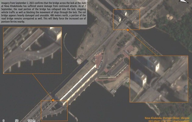 Швейцарський дослідник супутникових знімків Бенджамін Пітте (Benjamin Pittet) стверджує, що міст у Новій Каховці обвалився. Знімок він опублікував у Твіттері.