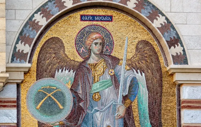 Архангел Михаїл – голова небесних сил (архістратиг). За церковними канонами він очолює всі дев'ять чинів ангелів і є головним воїном у битві добра і зла. За переказами, саме він переміг сатану, скинувши його та інших занепалих духів із небес. Озброєний мечем, він охороняє ворота раю.