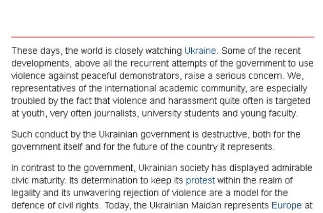 Представники світового академічного співтовариства підписали звернення з підтримкою українців, які обстоюють свої права на Майдані.