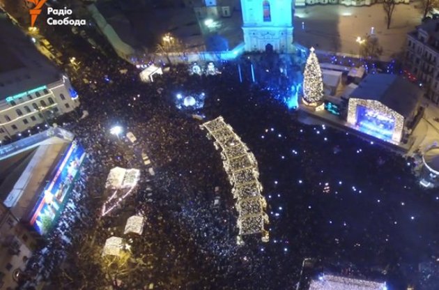 У Мережі з'явилося вражаюче відео святкування Нового Року в Києві на Софійській площі. Кадри зняті з допомогою безпілотника з висоти пташиного польоту. Ролик опублікувало видання Радіо Свобода, його записали за участю компанії Dronarium.