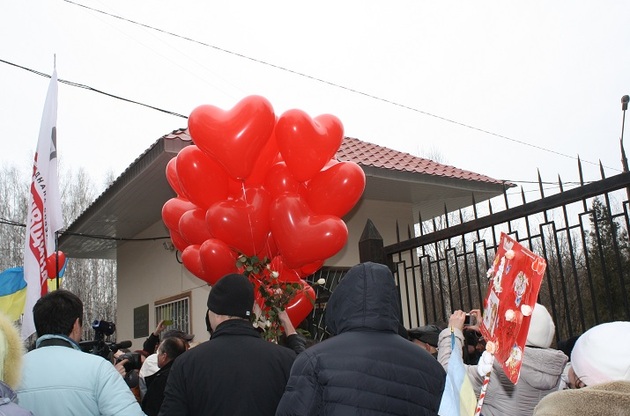 Прихильники екс-прем'єра 3 зібралися біля Центральної клінічної лікарні "Укрзалізниці" №5 (Харків), де знаходиться екс-прем'єр, щоб привітати її з 8 березня.