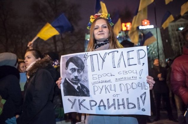 Люди прийшли з національними прапорами і без політичної символіки, а також з саморобними плакатами "Україна - єдина!", "Донбас - це Україна", "Ми за мир", "Путлер, руки геть від України".