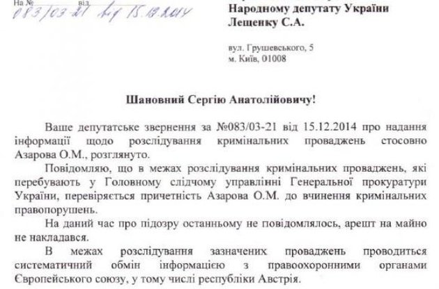 Генеральна прокуратура України не оголошувала про підозру синові екс-прем'єр-міністра України Олексію Азарову та не заарештовувала його власність, йде мова у відповіді на депутатський запит, який опублікував на своїй сторінці в Facebook народний депутат Сергій Лещенко.