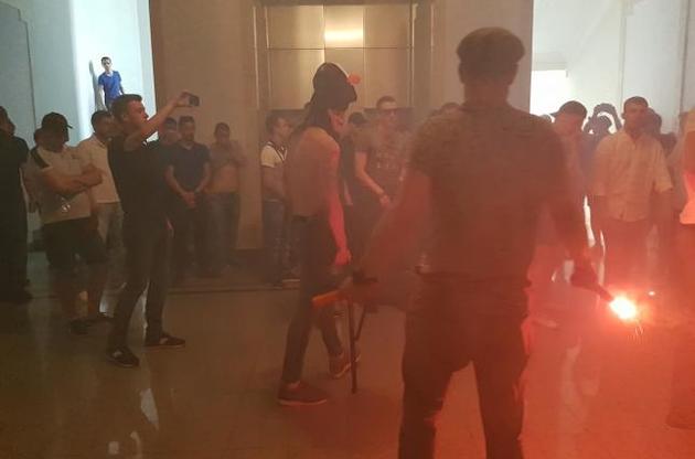 За словами очевидців, молоді люди у футболках "Нацкорпуса" влаштували погром на другому поверсі будівлі. Крім того, вони засунули у сміттєвий бак заступника мера Андрія Руденка, прорвалися на подвір'я міськради і там теж влаштували бійку.