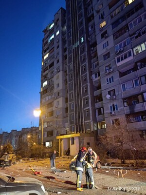 «17 березня о 5:02 до Служби порятунку 101 надійшло повідомлення про пожежу та руйнування житлового будинку у Дарницькому районі столиці. На місце події негайно прибули вогнеборці найближчих пожежно-рятувальних підрозділів. По прибуттю, рятувальники встановили, що внаслідок падіння залишків збитої ракети, сталося руйнування конструкцій будинку на 16-му та технічному поверсі, а також загоряння у квартирі на 16-му поверсі», – йдеться у повідомленні.